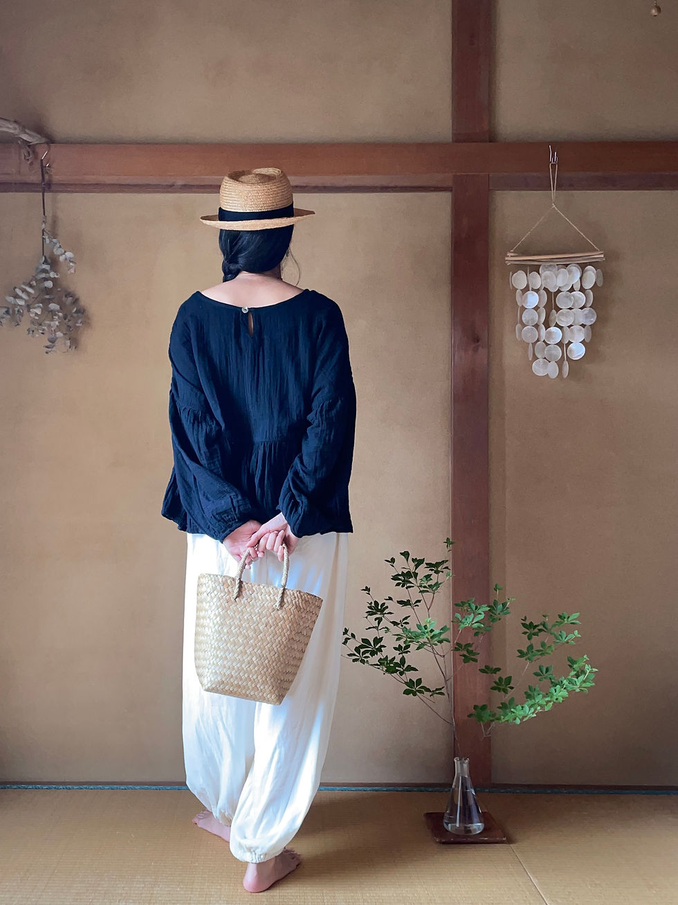 Double Gauze Frill Blouse (Wide Neck)in Black